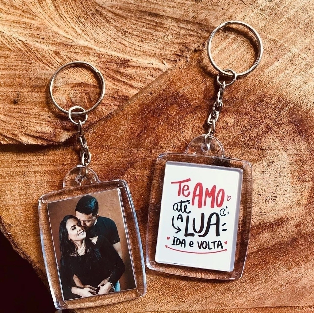 Você pode personalizar com sua foto e frase escolhida. O chaveiro tem impressão nos dois lados (frente e verso)
