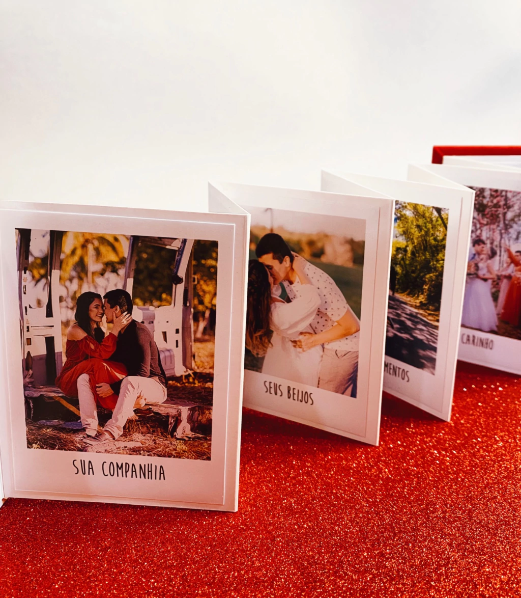 Lindo álbum de fotos no estilo sanfonado personalizado com 10 fotos e 10 motivos.
