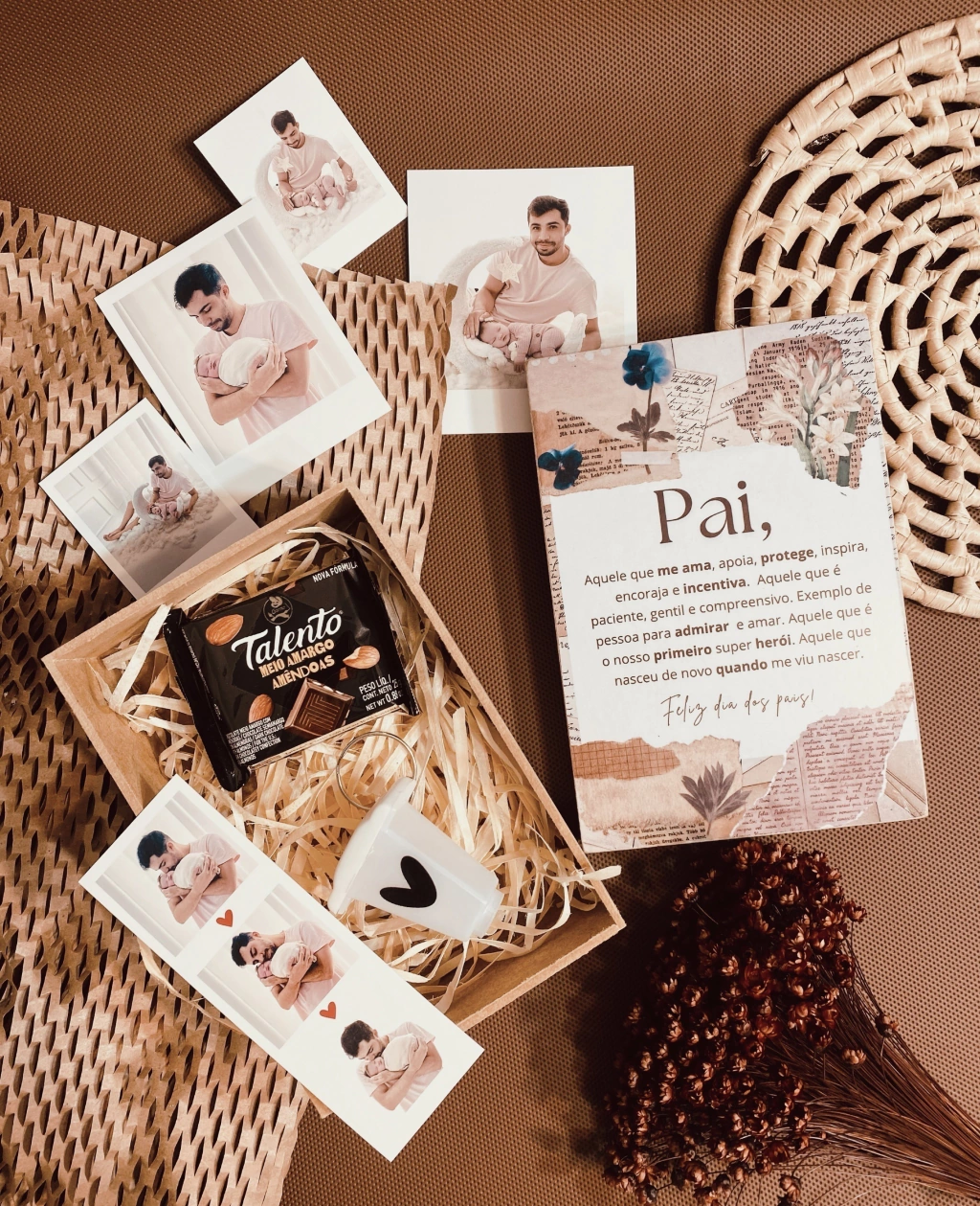 A Mini Box: Memórias é o presentinho completo que você tava procurando! Em formato de kit, esse mimo une vários produtos legais: fotos polaroid, um chocolate talento, um chaveiro monóculo e uma caixinha em MDF para presente. É só amor, né? Se joga nessa ideia e garanta já o seu! Vai ser sucesso garantido!