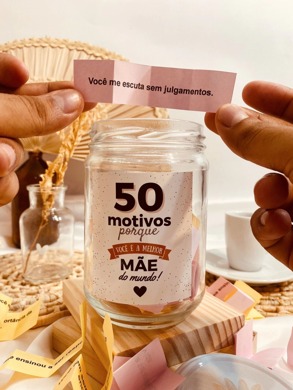 Lindo potinho com 50 motivos porque você é a melhor mãe do mundo! Uma ótima e diferenciada opção de presente para surpreender sua mãe nesse dia especial.