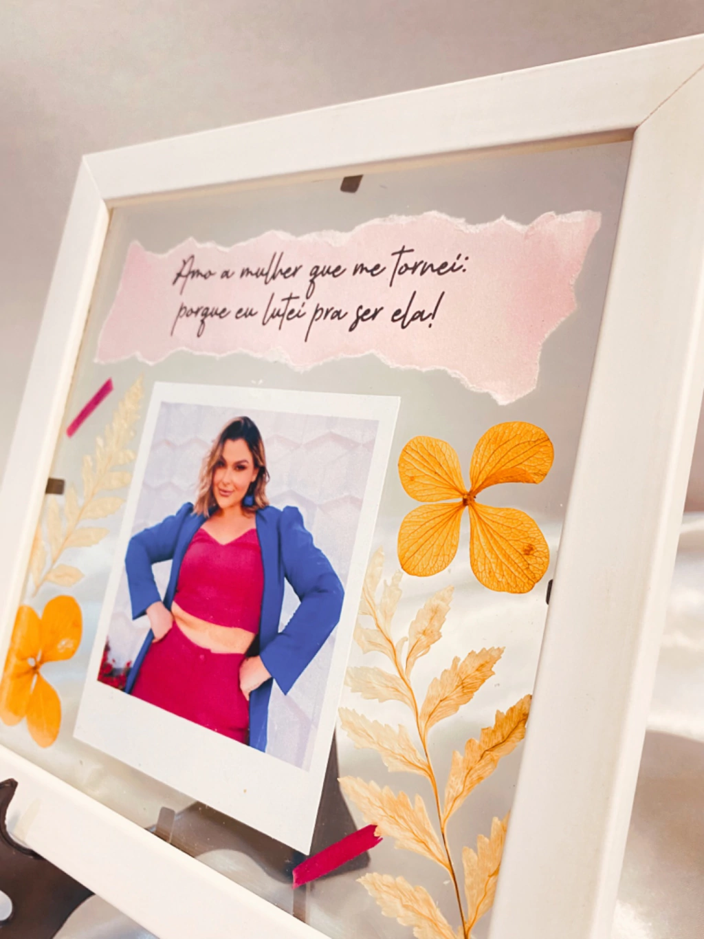 Lindo quadro com moldura, vidro e transparência com flores e foto + frase.