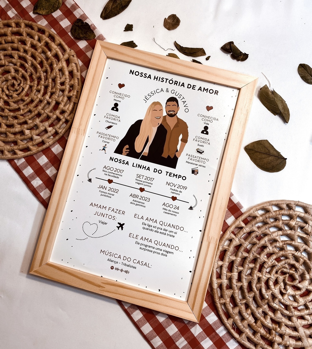 Celebre a história do seu amor com o Quadro Nossa História - Ilustração 20x30cm, um presente lindo, diferente e exclusivo! Este quadro decorativo permite personalizar com nomes, gostos, comidas preferidas e muito mais, tornando cada detalhe único e especial.