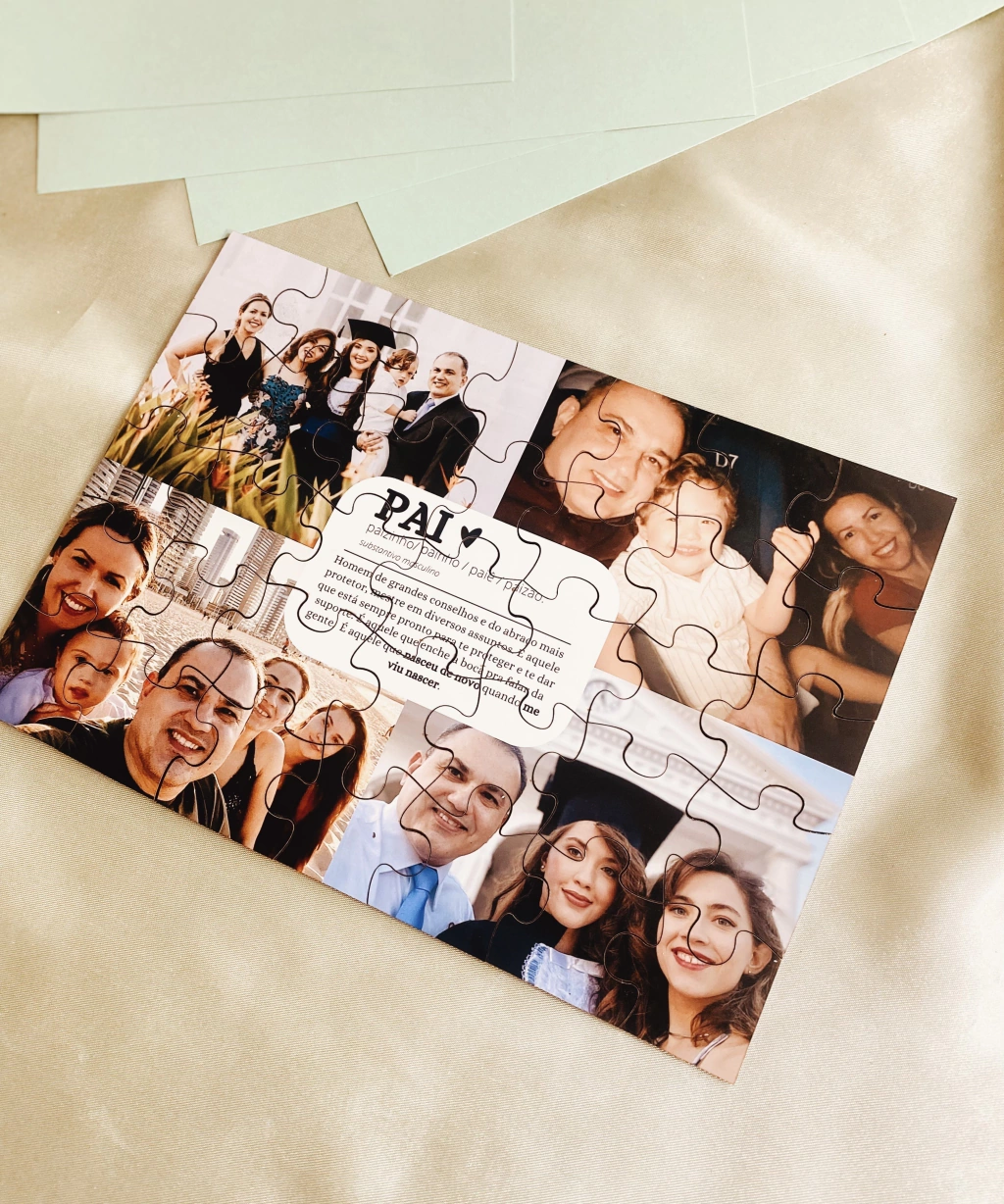 Quebra cabeça no tamanho 15x21, personalizado com 4 fotos e contém 35 peças.